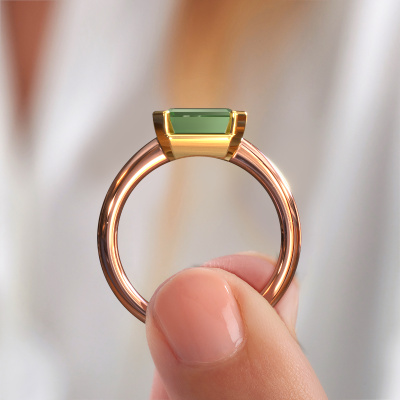 Der oben gezeigte Verlobungsring wird Tayler EME genannt. Wir nennen das einen Solitär-Ring, denn er hat einen einzelnen Edelstein. Es ist ein 14 Karat Roségold Verlobungsring, mit 8x6 mm smaragd schliff Turmalin grün. Dieser moderne Roségold Solitär-Ring mit exquisitem, smaragd schliff Turmalin grün ist ein schöner Verlobungsring. Die offenen Krappen ermöglichen, dass Licht aus mehr Winkeln auf den Edelstein trifft. Der Ring besticht auch durch die hohe Positionierung des Edelsteins. Denn Turmalin grün symbolisieren wahre Liebe und Reinheit und machen sie damit zum perfekten Geschenk für die Liebe Ihres Lebens. Das Symbol der ewigen Liebe ist das Herzstück dieses Solitär-Rings. Wie ein Turmalin grün haben auch alle anderen Arten von Edelmetallen ihre eigenen, zugeschriebenen symbolischen Bedeutungen. Diese Solitär Verlobungsring können Sie selbst zusammenstellen in verschiedenen Edelmetall Kombinationen. Dieser hat die Kombination 14 Karat Roségold mit Gold. Jedes Schmuckstück ist um Ihrem Finger Glanz zu verleihen. Jeder Ring wird von unseren Goldschmieden liebevoll von Hand gefertigt.Nach Erhalt Ihrer Bestellung beginnen unsere Goldschmiede mit Leidenschaft den kreativen Prozess und fertigen Ihren Verlobungsring in unserem eigenen Studio. Da wir keine großen Lager haben, werden diese Kosten nicht an Sie weitergegeben. Unsere Preisgestaltung ist der Beweis dafür! Wir bieten Schmuck zum niedrigsten Preis, garantiert.Unsere Designer und Goldschmiede arbeiten jeden Tag zusammen und versuchen, neue Schmuckstücke zu kreieren. Vielleicht haben Sie irgendwo einen schönen, moderne Verlobungsring gefunden, nach dem Ihr einzigartiger Ring gestaltet werden kann. Setzen Sie sich mit uns in Verbindung. Wir machen Ihnen ein Angebot, basierend auf einem fairen Preis/Leistungsverhältnis, das Sie begeistern wird.Um es einfacher zu machen, bieten wir eine kostenlose 30-tägige Rücksendung.