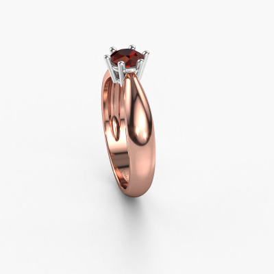 Der oben gezeigte Verlobungsring wird Fay genannt. Wir nennen das einen Solitär-Ring, denn er hat einen einzelnen Edelstein. Es ist ein 14 Karat Roségold Verlobungsring, mit 5 mm rund Granat. Dieser traditionell Roségold Solitär-Ring mit exquisitem, rund Granat ist ein schöner Verlobungsring. Die offenen Krappen ermöglichen, dass Licht aus mehr Winkeln auf den Edelstein trifft. Der Ring besticht auch durch die hohe Positionierung des Edelsteins. Denn Granat symbolisieren wahre Liebe und Reinheit und machen sie damit zum perfekten Geschenk für die Liebe Ihres Lebens. Das Symbol der ewigen Liebe ist das Herzstück dieses Solitär-Rings. Wie ein Granat haben auch alle anderen Arten von Edelmetallen ihre eigenen, zugeschriebenen symbolischen Bedeutungen. Diese Solitär Verlobungsring können Sie selbst zusammenstellen in verschiedenen Edelmetall Kombinationen. Dieser hat die Kombination 14 Karat Roségold mit Weißgold. Jedes Schmuckstück wird von unseren Meister-Goldschmieden in unserem eigenen Studio für Sie gefertigt.Durch die Kombination modernster Technik mit uralter Handwerkskunst können wir alle Verlobungsringe in unserem eigenen Studio anfertigen. Jedes Schmuckstück wird auf Anfrage gefertigt. Das ist vorteilhaft, weil wir Ihnen dadurch einen Preis anbieten können, den Sie nirgendwo anders finden.Haben Sie irgendwo einen bestimmten Verlobungsring gefunden, den Sie Ihrem Liebsten schenken möchten? Sie können uns gerne sagen, was Sie wollen und wir werden Ihr Design in einen Einzigartigen traditionell Verlobungsring verwandeln. Sie können die Entwicklungen Ihres Ringdesigns verfolgen, da wir 3D-Zeichnungen verwenden. Das gibt Ihnen eine realistische Vorschau, wie Ihr Design aussehen wird. Sie können auch einen Dummy vorbestellen. Ein Dummy ist ein Kunststoffring, der nach Ihrem Ringdesign gestaltet werden kann. Sie können ihn anprobieren und prüfen, ob seine Breite und Größe für Sie geeignet sind. Wir senden Ihnen gerne ein unverbindliches Angebot zu einem fairen Preis/Leistungsverhältnis. Sie werden in Anbetracht der Qualität des Rings und der Edelsteine überrascht sein.Um es einfacher zu machen, bieten wir eine kostenlose 30-tägige Rücksendung.