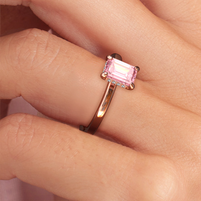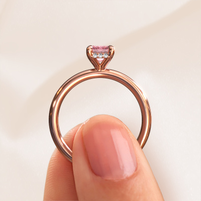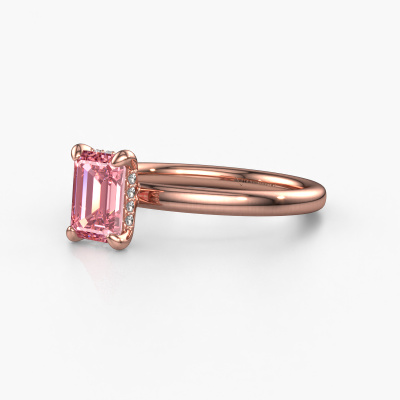 Der oben gezeigte Verlobungsring wird Simone EME 2 genannt. Wir nennen das einen Solitär-Ring, denn er hat einen einzelnen Edelstein. Es ist ein 14 Karat Roségold Verlobungsring, mit 7x5 mm smaragd schliff rosa Labordiamant. Dieser außergewöhnliche, traditionell Roségold Solitär-Verlobungsring mit einem schönen, smaragd schliff rosa Labordiamant soll Ihrem Antrag ein Funkeln geben. Die offenen Krappen ermöglichen, dass Licht aus mehr Winkeln auf den Edelstein trifft. Wussten Sie, dass ein rosa Labordiamant für ewige Liebe und Treue steht? Das macht ihn zum perfekten Mittelstück. Unsere Goldschmiede positioniert den Edelstein Ihrer Wahl sorgfältig oben auf dem Ring. Dadurch sticht er hervor. Jedes Schmuckstück wird hergestellt von einem Team leidenschaftlicher Goldschmiede und Schmuckdesigner. Das wird Ihr Kronjuwel unbedingt zu einem Blickfang machen.Mit unserer modernen Technik können wir Schmuckstücke von höchster Qualität mit größter Sorgfalt für Sie entwerfen und anpassen. Unsere Verlobungsringe sind immer um 30 Prozent günstiger als bei anderen Juwelieren. Wir fertigen Verlobungsringe auf Bestellung, also müssen wir keine großen Lager unterhalten. Wenn Sie ein bestimmtes Budget haben, beraten wir Sie gerne entsprechend.Haben Sie einen bestimmten Ring im Sinn? Eines, dass Sie irgendwo gesehen haben. Bitte zögern Sie nicht, uns zu sagen, was Sie wollen und wir werden Ihr Design in einen Einzigartigen Verlobungsring verwandeln. Sie können die Entwicklungen Ihres Ringdesigns verfolgen, da wir 3D-Zeichnungen verwenden. Das gibt Ihnen eine realistische Vorschau Ihres Designs. Wir senden Ihnen gerne ein unverbindliches Angebot zu einem fairen Preis/Leistungsverhältnis. Es wird Sie erstaunen.Um es einfacher zu machen, bieten wir eine kostenlose 30-tägige Rücksendung.