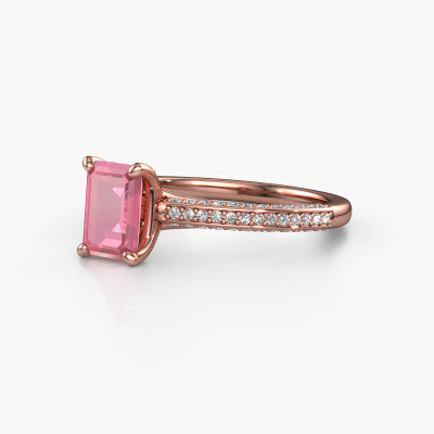 Der oben gezeigte Ring wird Elenore eme genannt. Es ist ein Pavé Solitär Ring, da er einen zentralen Edelstein und ein Band mit Pavé-Fassung hat. Dieser 14 Karat Roségold ring ist mit einem 7x5 mm smaragd schliff Turmalin rosa-Mittelstein besetzt und das Band hat eine Pavé-Fassung mit Lab grown Diamant. Jedes Schmuckstück wird nur für Sie persönlich hergestellt, mit Liebe zum Detail und Design.Dieser exklusive Roségold Pavé Solitär Verlobungsring mit Pavé-Fassung hat einen exquisiten, smaragd schliff Turmalin rosa als Mittelstein. Um den zentralen Stein noch mehr zu betonen, hat das Band eine Pavé-Fassung mit weiteren Lab grown Diamant. Durch die offenen Krappen kann das Licht aus mehreren Winkeln auf den Turmalin rosa treffen und der Turmalin rosa-Ring funkelt noch mehr. Das obere Foto zeigt die leidenschaftlich handgefertigten Details des Rings. Die hohe Positionierung der Mittelstein ist ein echter Blickfang. Der perfekte Verlobungsring für das Kronjuwel Ihres Lebens!Haben Sie ein bestimmtes Budget? Sie können uns gerne kontaktieren, damit wir Ihre Optionen besprechen können. Wir bieten unsere Verlobungsringe zum garantiert besten Preis, denn wir fertigen sie auf Bestellung. Solche Preise finden Sie nirgendwo anders!Haben Sie irgendwo einen bestimmten Verlobungsring gefunden, den Sie Ihrem Liebsten schenken möchten? Sie können uns gerne sagen, was Sie wollen und wir werden Ihr Design in einen Einzigartigen exklusive Verlobungsring verwandeln. Sie können die Entwicklungen Ihres Ringdesigns verfolgen, da wir 3D-Zeichnungen verwenden. Das gibt Ihnen eine realistische Vorschau, wie Ihr Design aussehen wird. Sie können auch einen Dummy vorbestellen. Ein Dummy ist ein Kunststoffring, der nach Ihrem Ringdesign gestaltet werden kann. Sie können ihn anprobieren und prüfen, ob seine Breite und Größe für Sie geeignet sind. Wir senden Ihnen gerne ein unverbindliches Angebot zu einem fairen Preis/Leistungsverhältnis. Sie werden in Anbetracht der Qualität des Rings und der Edelsteine überrascht sein.Um es einfacher zu machen, bieten wir eine kostenlose 30-tägige Rücksendung.