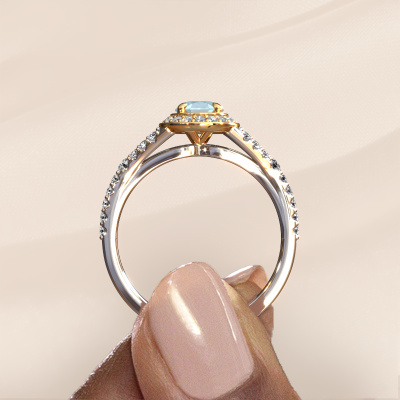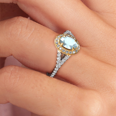 Der oben gezeigte Verlobungsring wird Pamela OVL genannt. Es ist ein Halo Ring, da er einen zentralen Edelstein und ein Band mit Pavé-Fassung hat. Der 14 Karat Weißgold ring ist mit einem 7x5 mm oval Aquamarin-Mittelstein besetzt und um ihn herum eine Pavé-Fassung mit Lab grown Diamant. Was diesen Luxus, Weißgold Halo Ring besonders macht, sind die kleineren Steine, die den zentralen Stein umschließen. Dieser wunderschöne Verlobungsring wird als Halo Ring bezeichnet, da die kleineren Edelsteine dem zentralen Stein einen Lichthof geben. Damit die kleineren Steine den Mittelstein verstärken, müssen sie so platziert werden, dass keine Lichteinflüsse auftreten. Und hier kommen unsere erfahrenen Goldschmiede ins Spiel. Jeder einzelne Stein wird sorgfältig von Hand in den Ring gesetzt. Während der Herstellung wird der Lichteinfall ständig überprüft. So können wir sicherstellen, dass der spezielle Lichtkranz noch sichtbar ist. Am Ende erhalten Sie einen einzigartigen Verlobungsring mit einem Aquamarins Ihrer Wahl in der Mitte. Sie können sich die Wirkung eines solchen Ringes vorstellen, wenn Sie ihn an ihrem besonderen Tag für sie zum Leuchten bringen. Mit unserer modernen Technik können wir Schmuckstücke von höchster Qualität mit größter Sorgfalt für Sie entwerfen und anpassen. Unsere Verlobungsringe sind immer um 30 Prozent günstiger als bei anderen Juwelieren. Wir fertigen Verlobungsringe auf Bestellung, also müssen wir keine großen Lager unterhalten. Wenn Sie ein bestimmtes Budget haben, beraten wir Sie gerne entsprechend.Unser Team fügt unserer Online-Kollektion täglich neue Designs hinzu. Unsere Designer und Goldschmiede arbeiten zusammen, um das beste Design zu kreieren. Wir bemühen uns, eine vielfältige Kollektion von Schmuckstücken anzubieten. Vielleicht haben Sie ein bestimmtes Design im Sinn. Eines, dass Sie irgendwo gesehen haben. Gerne geben wir Ihnen eine kostenlose Beratung. Wir machen Ihnen ein Angebot, basierend auf einem fairen Preis/Leistungsverhältnis, das Sie verblüffen wird.Um es einfacher zu machen, bieten wir eine kostenlose 30-tägige Rücksendung.