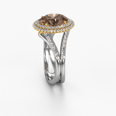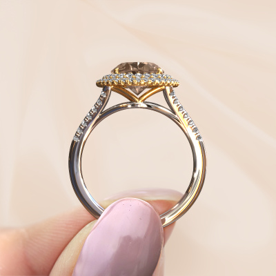 Der oben gezeigte Verlobungsring wird Elvie genannt. Es ist ein Halo Ring, da er einen zentralen Edelstein und ein Band mit Pavé-Fassung hat. Der 14 Karat Weißgold ring ist mit einem 2.70 crt oval Braun Diamant-Mittelstein besetzt und um ihn herum eine Pavé-Fassung mit Lab grown Diamant. Was diesen Vintage, Weißgold Pavé Solitär Ring besonders macht, sind die kleineren Steine, die den zentralen Stein umschließen. Dieser wunderschöne Verlobungsring wird als Pavé Solitär Ring bezeichnet, da die kleineren Edelsteine dem zentralen Stein einen Lichthof geben. Damit die kleineren Steine den Mittelstein verstärken, müssen sie so platziert werden, dass keine Lichteinflüsse auftreten. Und hier kommen unsere erfahrenen Goldschmiede ins Spiel. Jeder einzelne Stein wird sorgfältig von Hand in den Ring gesetzt. Während der Herstellung wird der Lichteinfall ständig überprüft. So können wir sicherstellen, dass der spezielle Lichtkranz noch sichtbar ist. Am Ende erhalten Sie einen einzigartigen Verlobungsring mit einem Braune Diamanten Ihrer Wahl in der Mitte. Sie können sich die Wirkung eines solchen Ringes vorstellen, wenn Sie ihn an ihrem besonderen Tag für sie zum Leuchten bringen. Mit unserer modernen Technik können wir Schmuckstücke von höchster Qualität mit größter Sorgfalt für Sie entwerfen und anpassen. Unsere Verlobungsringe sind immer um 30 Prozent günstiger als bei anderen Juwelieren. Wir fertigen Verlobungsringe auf Bestellung, also müssen wir keine großen Lager unterhalten. Wenn Sie ein bestimmtes Budget haben, beraten wir Sie gerne entsprechend.Haben Sie einen bestimmten Ring im Sinn? Eines, dass Sie irgendwo gesehen haben. Bitte zögern Sie nicht, uns zu sagen, was Sie wollen und wir werden Ihr Design in einen Einzigartigen Verlobungsring verwandeln. Sie können die Entwicklungen Ihres Ringdesigns verfolgen, da wir 3D-Zeichnungen verwenden. Das gibt Ihnen eine realistische Vorschau Ihres Designs. Wir senden Ihnen gerne ein unverbindliches Angebot zu einem fairen Preis/Leistungsverhältnis. Es wird Sie erstaunen.Um es einfacher zu machen, bieten wir eine kostenlose 30-tägige Rücksendung.