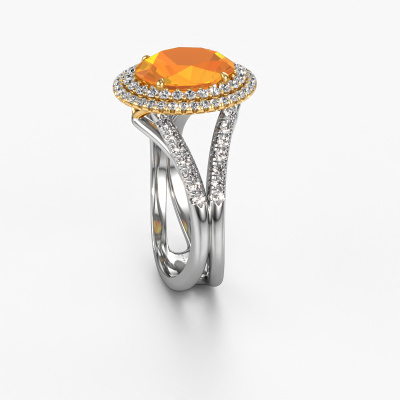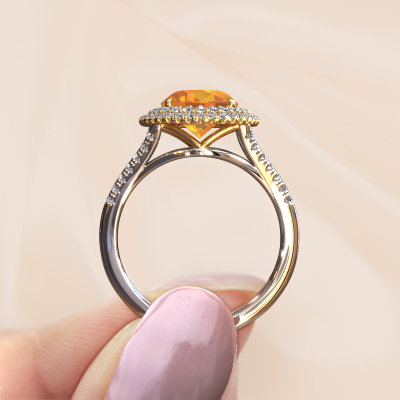 Der oben gezeigte Verlobungsring wird Elvie genannt. Es ist ein Halo Ring, da er einen zentralen Edelstein und ein Band mit Pavé-Fassung hat. Der 14 Karat Weißgold ring ist mit einem 10x8 mm oval Citrin-Mittelstein besetzt und um ihn herum eine Pavé-Fassung mit Lab grown Diamant. Was diesen Vintage, Weißgold Pavé Solitär Ring besonders macht, sind die kleineren Steine, die den zentralen Stein umschließen. Dieser wunderschöne Verlobungsring wird als Pavé Solitär Ring bezeichnet, da die kleineren Edelsteine dem zentralen Stein einen Lichthof geben. Damit die kleineren Steine den Mittelstein verstärken, müssen sie so platziert werden, dass keine Lichteinflüsse auftreten. Und hier kommen unsere erfahrenen Goldschmiede ins Spiel. Jeder einzelne Stein wird sorgfältig von Hand in den Ring gesetzt. Während der Herstellung wird der Lichteinfall ständig überprüft. So können wir sicherstellen, dass der spezielle Lichtkranz noch sichtbar ist. Am Ende erhalten Sie einen einzigartigen Verlobungsring mit einem Citrin Ihrer Wahl in der Mitte. Sie können sich die Wirkung eines solchen Ringes vorstellen, wenn Sie ihn an ihrem besonderen Tag für sie zum Leuchten bringen. Mit unserer modernen Technik können wir Schmuckstücke von höchster Qualität mit größter Sorgfalt für Sie entwerfen und anpassen. Unsere Verlobungsringe sind immer um 30 Prozent günstiger als bei anderen Juwelieren. Wir fertigen Verlobungsringe auf Bestellung, also müssen wir keine großen Lager unterhalten. Wenn Sie ein bestimmtes Budget haben, beraten wir Sie gerne entsprechend.Haben Sie einen bestimmten Ring im Sinn? Eines, dass Sie irgendwo gesehen haben. Bitte zögern Sie nicht, uns zu sagen, was Sie wollen und wir werden Ihr Design in einen Einzigartigen Verlobungsring verwandeln. Sie können die Entwicklungen Ihres Ringdesigns verfolgen, da wir 3D-Zeichnungen verwenden. Das gibt Ihnen eine realistische Vorschau Ihres Designs. Wir senden Ihnen gerne ein unverbindliches Angebot zu einem fairen Preis/Leistungsverhältnis. Es wird Sie erstaunen.Um es einfacher zu machen, bieten wir eine kostenlose 30-tägige Rücksendung.