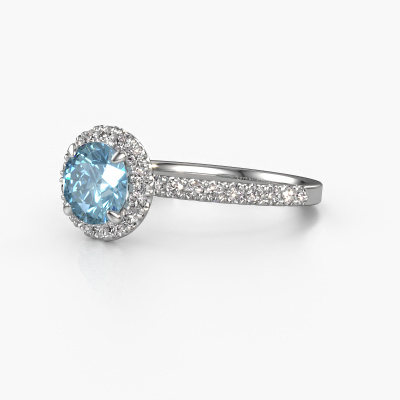 Der oben gezeigte Verlobungsring wird Miranda rnd genannt. Es ist ein Halo Ring, da er einen zentralen Edelstein und ein Band mit Pavé-Fassung hat. Der 14 Karat Weißgold ring ist mit einem 6.5 mm rund blauer Labordiamant-Mittelstein besetzt und um ihn herum eine Pavé-Fassung mit Lab grown Diamant. Was diesen exklusive, Weißgold Halo Ring besonders macht, sind die kleineren Steine, die den zentralen Stein umschließen. Dieser wunderschöne Verlobungsring wird als Halo Ring bezeichnet, da die kleineren Edelsteine dem zentralen Stein einen Lichthof geben. Damit die kleineren Steine den Mittelstein verstärken, müssen sie so platziert werden, dass keine Lichteinflüsse auftreten. Und hier kommen unsere erfahrenen Goldschmiede ins Spiel. Jeder einzelne Stein wird sorgfältig von Hand in den Ring gesetzt. Während der Herstellung wird der Lichteinfall ständig überprüft. So können wir sicherstellen, dass der spezielle Lichtkranz noch sichtbar ist. Am Ende erhalten Sie einen einzigartigen Verlobungsring mit einem blauer Labordiamanten Ihrer Wahl in der Mitte. Sie können sich die Wirkung eines solchen Ringes vorstellen, wenn Sie ihn an ihrem besonderen Tag für sie zum Leuchten bringen. Mit unserer modernen Technik können wir Schmuckstücke von höchster Qualität mit größter Sorgfalt für Sie entwerfen und anpassen. Unsere Verlobungsringe sind immer um 30 Prozent günstiger als bei anderen Juwelieren. Wir fertigen Verlobungsringe auf Bestellung, also müssen wir keine großen Lager unterhalten. Wenn Sie ein bestimmtes Budget haben, beraten wir Sie gerne entsprechend.Haben Sie irgendwo einen bestimmten Verlobungsring gefunden, den Sie Ihrem Liebsten schenken möchten? Sie können uns gerne sagen, was Sie wollen und wir werden Ihr Design in einen Einzigartigen exklusive Verlobungsring verwandeln. Sie können die Entwicklungen Ihres Ringdesigns verfolgen, da wir 3D-Zeichnungen verwenden. Das gibt Ihnen eine realistische Vorschau, wie Ihr Design aussehen wird. Sie können auch einen Dummy vorbestellen. Ein Dummy ist ein Kunststoffring, der nach Ihrem Ringdesign gestaltet werden kann. Sie können ihn anprobieren und prüfen, ob seine Breite und Größe für Sie geeignet sind. Wir senden Ihnen gerne ein unverbindliches Angebot zu einem fairen Preis/Leistungsverhältnis. Sie werden in Anbetracht der Qualität des Rings und der Edelsteine überrascht sein.Um es einfacher zu machen, bieten wir eine kostenlose 30-tägige Rücksendung.