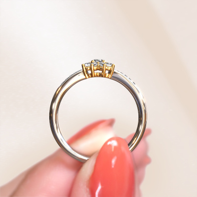 Der oben gezeigte Ring wird Camille 2 genannt. Ein Flower Ring mit einem zentralen Edelstein, umgeben von kleineren Steinen, wir nennen das einen Cluster Ring. Diese Version in 14 Karat Weißgold hat einen 0.10 crt rund Diamant als Mittelstein, umschlossen von kleineren Diamanten. Wenn Sie einen Weißgold Flower Verlobungsring sehen, werden Sie vielleicht den Eindruck bekommen, dass seine kleineren Steine mit dem größeren Diamant aufeinanderprallen. Deshalb ist er wie eine Blume geformt. Deshalb ist dieser Verlobungsring auch als Blumen- oder Rosetten Fassung bekannt. Es ist sehr wichtig, dass die kleineren Diamanten identisch positioniert sind, so dass es kein Spiel im Licht, sondern eine perfekte Einheit ergibt. Unsere erfahrenen Juweliere erledigen diese Arbeit. Jeder einzelne Stein wird sorgfältig von Hand gesetzt. Während der Herstellung wird der Lichteinfall ständig überwacht. Am Ende bekommen Sie den perfekten Verlobungsring mit einem strahlenden Diamant Edelstein Herzstück. Sie können sich die Wirkung eines solchen Ringes vorstellen, wenn Sie ihn an ihrem besonderen Tag für die Liebe Ihres Lebens zum Leuchten bringen. Da wir unsere eigenen Ringe entwerfen und liefern, können wir Ihnen einen Verlobungsring zu einem Preis anbieten, den Sie nirgendwo anders finden. Ein Ring wird auf Bestellung angefertigt, wodurch kein überschüssiges Material anfällt. So können wir Ihnen ein gutes Angebot zum besten Preis machen. Wir verstehen, dass es sich riskant anfühlt, Ihren Verlobungsring online zu kaufen. Jedoch helfen wir Ihnen gerne beim Designprozess unter Berücksichtigung Ihres Budgets.Unser Team fügt unserer Online-Kollektion täglich neue Designs hinzu. Unsere Designer und Goldschmiede arbeiten zusammen, um das beste Design zu kreieren. Wir bemühen uns, eine vielfältige Kollektion von Schmuckstücken anzubieten. Vielleicht haben Sie ein bestimmtes Design im Sinn. Eines, dass Sie irgendwo gesehen haben. Gerne geben wir Ihnen eine kostenlose Beratung. Wir machen Ihnen ein Angebot, basierend auf einem fairen Preis/Leistungsverhältnis, das Sie verblüffen wird.Um es einfacher zu machen, bieten wir eine kostenlose 30-tägige Rücksendung.