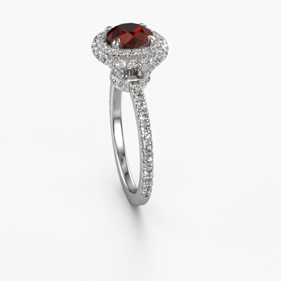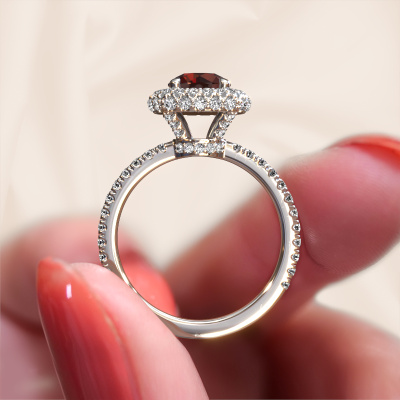 Der oben gezeigte Verlobungsring wird Talitha RND genannt. Es ist ein Halo Ring, da er einen zentralen Edelstein und ein Band mit Pavé-Fassung hat. Der 14 Karat Weißgold ring ist mit einem 6.5 mm rund Granat-Mittelstein besetzt und um ihn herum eine Pavé-Fassung mit Lab grown Diamant. Was diesen exklusive, Weißgold Halo Ring besonders macht, sind die kleineren Steine, die den zentralen Stein umschließen. Dieser wunderschöne Verlobungsring wird als Halo Ring bezeichnet, da die kleineren Edelsteine dem zentralen Stein einen Lichthof geben. Damit die kleineren Steine den Mittelstein verstärken, müssen sie so platziert werden, dass keine Lichteinflüsse auftreten. Und hier kommen unsere erfahrenen Goldschmiede ins Spiel. Jeder einzelne Stein wird sorgfältig von Hand in den Ring gesetzt. Während der Herstellung wird der Lichteinfall ständig überprüft. So können wir sicherstellen, dass der spezielle Lichtkranz noch sichtbar ist. Am Ende erhalten Sie einen einzigartigen Verlobungsring mit einem Granat Ihrer Wahl in der Mitte. Sie können sich die Wirkung eines solchen Ringes vorstellen, wenn Sie ihn an ihrem besonderen Tag für sie zum Leuchten bringen. Haben Sie ein bestimmtes Budget? Sie können uns gerne kontaktieren, damit wir Ihre Optionen besprechen können. Wir bieten unsere Verlobungsringe zum garantiert besten Preis, denn wir fertigen sie auf Bestellung. Solche Preise finden Sie nirgendwo anders!Unser Team fügt unserer Online-Kollektion täglich neue Designs hinzu. Unsere Designer und Goldschmiede arbeiten zusammen, um das beste Design zu kreieren. Wir bemühen uns, eine vielfältige Kollektion von Schmuckstücken anzubieten. Vielleicht haben Sie ein bestimmtes Design im Sinn. Eines, dass Sie irgendwo gesehen haben. Gerne geben wir Ihnen eine kostenlose Beratung. Wir machen Ihnen ein Angebot, basierend auf einem fairen Preis/Leistungsverhältnis, das Sie verblüffen wird.Um es einfacher zu machen, bieten wir eine kostenlose 30-tägige Rücksendung.
