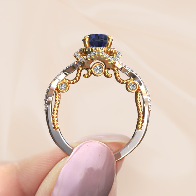 Der oben gezeigte Verlobungsring wird Leora genannt. Es ist ein Halo Ring, da er einen zentralen Edelstein und ein Band mit Pavé-Fassung hat. Der 14 Karat Weißgold ring ist mit einem 6.5 mm rund Saphir-Mittelstein besetzt und um ihn herum eine Pavé-Fassung mit Lab grown Diamant. Was diesen Vintage, Weißgold Halo Ring besonders macht, sind die kleineren Steine, die den zentralen Stein umschließen. Dieser wunderschöne Verlobungsring wird als Halo Ring bezeichnet, da die kleineren Edelsteine dem zentralen Stein einen Lichthof geben. Damit die kleineren Steine den Mittelstein verstärken, müssen sie so platziert werden, dass keine Lichteinflüsse auftreten. Und hier kommen unsere erfahrenen Goldschmiede ins Spiel. Jeder einzelne Stein wird sorgfältig von Hand in den Ring gesetzt. Während der Herstellung wird der Lichteinfall ständig überprüft. So können wir sicherstellen, dass der spezielle Lichtkranz noch sichtbar ist. Am Ende erhalten Sie einen einzigartigen Verlobungsring mit einem Saphir Ihrer Wahl in der Mitte. Sie können sich die Wirkung eines solchen Ringes vorstellen, wenn Sie ihn an ihrem besonderen Tag für sie zum Leuchten bringen. Mit unserer modernen Technik können wir Schmuckstücke von höchster Qualität mit größter Sorgfalt für Sie entwerfen und anpassen. Unsere Verlobungsringe sind immer um 30 Prozent günstiger als bei anderen Juwelieren. Wir fertigen Verlobungsringe auf Bestellung, also müssen wir keine großen Lager unterhalten. Wenn Sie ein bestimmtes Budget haben, beraten wir Sie gerne entsprechend.Unsere Designer und Goldschmiede arbeiten jeden Tag zusammen und versuchen, neue Schmuckstücke zu kreieren. Vielleicht haben Sie irgendwo einen schönen, Vintage Verlobungsring gefunden, nach dem Ihr einzigartiger Ring gestaltet werden kann. Setzen Sie sich mit uns in Verbindung. Wir machen Ihnen ein Angebot, basierend auf einem fairen Preis/Leistungsverhältnis, das Sie begeistern wird.Um es einfacher zu machen, bieten wir eine kostenlose 30-tägige Rücksendung.