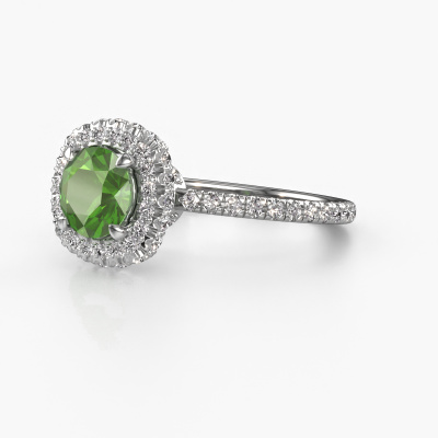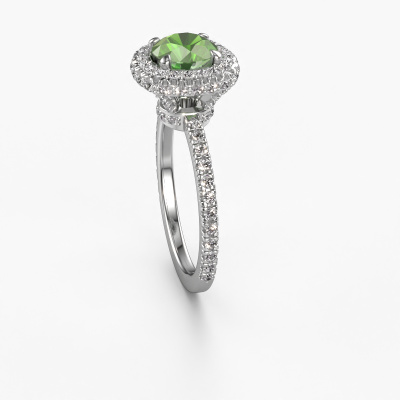Der oben gezeigte Verlobungsring wird Talitha RND genannt. Es ist ein Halo Ring, da er einen zentralen Edelstein und ein Band mit Pavé-Fassung hat. Der 14 Karat Weißgold ring ist mit einem 6.5 mm rund Turmalin grün-Mittelstein besetzt und um ihn herum eine Pavé-Fassung mit Lab grown Diamant. Was diesen exklusive, Weißgold Halo Ring besonders macht, sind die kleineren Steine, die den zentralen Stein umschließen. Dieser wunderschöne Verlobungsring wird als Halo Ring bezeichnet, da die kleineren Edelsteine dem zentralen Stein einen Lichthof geben. Damit die kleineren Steine den Mittelstein verstärken, müssen sie so platziert werden, dass keine Lichteinflüsse auftreten. Und hier kommen unsere erfahrenen Goldschmiede ins Spiel. Jeder einzelne Stein wird sorgfältig von Hand in den Ring gesetzt. Während der Herstellung wird der Lichteinfall ständig überprüft. So können wir sicherstellen, dass der spezielle Lichtkranz noch sichtbar ist. Am Ende erhalten Sie einen einzigartigen Verlobungsring mit einem grüner Turmalin Ihrer Wahl in der Mitte. Sie können sich die Wirkung eines solchen Ringes vorstellen, wenn Sie ihn an ihrem besonderen Tag für sie zum Leuchten bringen. Haben Sie ein bestimmtes Budget? Sie können uns gerne kontaktieren, damit wir Ihre Optionen besprechen können. Wir bieten unsere Verlobungsringe zum garantiert besten Preis, denn wir fertigen sie auf Bestellung. Solche Preise finden Sie nirgendwo anders!Unser Team fügt unserer Online-Kollektion täglich neue Designs hinzu. Unsere Designer und Goldschmiede arbeiten zusammen, um das beste Design zu kreieren. Wir bemühen uns, eine vielfältige Kollektion von Schmuckstücken anzubieten. Vielleicht haben Sie ein bestimmtes Design im Sinn. Eines, dass Sie irgendwo gesehen haben. Gerne geben wir Ihnen eine kostenlose Beratung. Wir machen Ihnen ein Angebot, basierend auf einem fairen Preis/Leistungsverhältnis, das Sie verblüffen wird.Um es einfacher zu machen, bieten wir eine kostenlose 30-tägige Rücksendung.