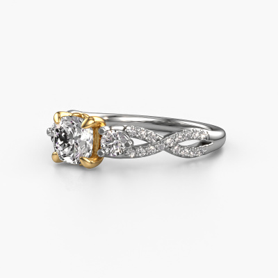 Der oben gezeigte Weißgold Verlobungsring wird Marilou CUS genannt. Es ist ein 3-stone Ring, da er einen zentralen Edelstein und ein Band mit Pavé-Fassung hat. Der traditionell 3-stone Verlobungsring ist in der Kombination 14 Karat Weißgold mit Gold und ist mit einem cussion 1.00 crt Diamant-Mittelstein besetzt und das Band hat eine Pavé-Fassung mit Diamanten. Jedes Schmuckstück ist einzigartig in jeder Hinsicht! Einfach nach Ihren Wünschen anzupassen. Um den zentralen Stein noch mehr zu betonen, hat das Band eine Pavé-Fassung mit weiteren Diamant. Durch die offenen Krappen kann das Licht aus mehreren Winkeln auf den Diamant treffen und der Diamant-Ring funkelt noch mehr. Das obere Foto zeigt die leidenschaftlich handgefertigten Details des Rings. Die hohe Positionierung der Mittelstein ist ein echter Blickfang. Der perfekte Verlobungsring für das Kronjuwel Ihres Lebens!Durch die Kombination modernster Technik mit uralter Handwerkskunst können wir alle Verlobungsringe in unserem eigenen Studio anfertigen. Jedes Schmuckstück wird auf Anfrage gefertigt. Das ist vorteilhaft, weil wir Ihnen dadurch einen Preis anbieten können, den Sie nirgendwo anders finden.Unser Team fügt unserer Online-Kollektion täglich neue Designs hinzu. Unsere Designer und Goldschmiede arbeiten zusammen, um das beste Design zu kreieren. Wir bemühen uns, eine vielfältige Kollektion von Schmuckstücken anzubieten. Vielleicht haben Sie ein bestimmtes Design im Sinn. Eines, dass Sie irgendwo gesehen haben. Gerne geben wir Ihnen eine kostenlose Beratung. Wir machen Ihnen ein Angebot, basierend auf einem fairen Preis/Leistungsverhältnis, das Sie verblüffen wird.Um es einfacher zu machen, bieten wir eine kostenlose 30-tägige Rücksendung.