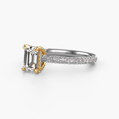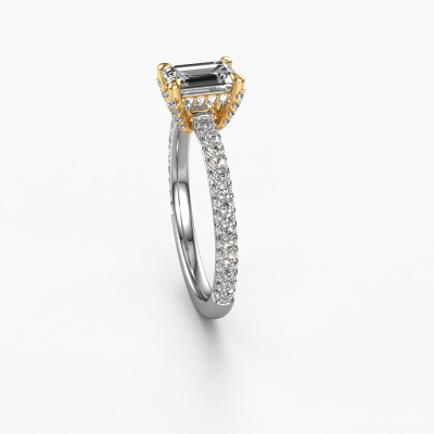 Der oben gezeigte Weißgold Verlobungsring wird Saskia eme 2 genannt. Es ist ein Pavé Solitär Ring, da er einen zentralen Edelstein und ein Band mit Pavé-Fassung hat. Der exklusive Pavé Solitär Verlobungsring ist in der Kombination 14 Karat Weißgold mit Gold und ist mit einem smaragd schliff 0.90 crt Diamant-Mittelstein besetzt und das Band hat eine Pavé-Fassung mit Diamanten. Jedes Schmuckstück wird hergestellt von einem Team leidenschaftlicher Goldschmiede und Schmuckdesigner. Das wird Ihr Kronjuwel unbedingt zu einem Blickfang machen. Um den zentralen Stein noch mehr zu betonen, hat das Band eine Pavé-Fassung mit weiteren Diamant. Durch die offenen Krappen kann das Licht aus mehreren Winkeln auf den Diamant treffen und der Diamant-Ring funkelt noch mehr. Das obere Foto zeigt die leidenschaftlich handgefertigten Details des Rings. Die hohe Positionierung der Mittelstein ist ein echter Blickfang. Der perfekte Verlobungsring für das Kronjuwel Ihres Lebens!Mit unserer modernen Technik können wir Schmuckstücke von höchster Qualität mit größter Sorgfalt für Sie entwerfen und anpassen. Unsere Verlobungsringe sind immer um 30 Prozent günstiger als bei anderen Juwelieren. Wir fertigen Verlobungsringe auf Bestellung, also müssen wir keine großen Lager unterhalten. Wenn Sie ein bestimmtes Budget haben, beraten wir Sie gerne entsprechend.Verschiedene Arten von neuen Ringen werden täglich von unserem Team angefertigt. Vielleicht haben Sie irgendwo einen Pavé Solitär Verlobungsring gefunden. Einen, den Sie Ihrem Liebsten schenken möchten. Bitte zögern Sie nicht, unseren Schmuckdesignern Ihre Gedanken und Ihr Design zu zeigen. Wir würden gerne Ihr Design in einen exklusive Verlobungsring verwandeln. Sie können die Entwicklungen Ihres Ringdesigns verfolgen, da wir sehr detaillierte 3D-Zeichnungen verwenden. Darüber hinaus können Sie einen Dummy des Designs bestellen. Ein Dummy ist ein Kunststoffring, der nach Ihrem Ringdesign gestaltet werden kann. Sie können ihn anprobieren und prüfen, ob der Verlobungsring Ihren Vorstellungen entspricht. Wir senden Ihnen gerne ein unverbindliches Angebot zu einem fairen Preis/Leistungsverhältnis. Das Angebot wird Sie angesichts der Qualität des Rings und der Edelsteine verblüffen.Um es einfacher zu machen, bieten wir eine kostenlose 30-tägige Rücksendung.