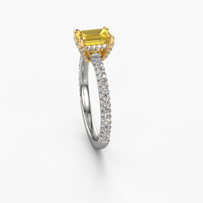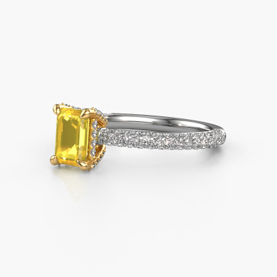 Der oben gezeigte Weißgold Verlobungsring wird Saskia eme 2 genannt. Es ist ein Pavé Solitär Ring, da er einen zentralen Edelstein und ein Band mit Pavé-Fassung hat. Der exklusive Pavé Solitär Verlobungsring ist in der Kombination 14 Karat Weißgold mit Gold und ist mit einem smaragd schliff 6.5x4.5 mm Gelb Saphir-Mittelstein besetzt und das Band hat eine Pavé-Fassung mit Diamanten. Jedes Schmuckstück wird hergestellt von einem Team leidenschaftlicher Goldschmiede und Schmuckdesigner. Das wird Ihr Kronjuwel unbedingt zu einem Blickfang machen. Um den zentralen Stein noch mehr zu betonen, hat das Band eine Pavé-Fassung mit weiteren Gelb Saphir. Durch die offenen Krappen kann das Licht aus mehreren Winkeln auf den Gelb Saphir treffen und der Gelb Saphir-Ring funkelt noch mehr. Das obere Foto zeigt die leidenschaftlich handgefertigten Details des Rings. Die hohe Positionierung der Mittelstein ist ein echter Blickfang. Der perfekte Verlobungsring für das Kronjuwel Ihres Lebens!Mit unserer modernen Technik können wir Schmuckstücke von höchster Qualität mit größter Sorgfalt für Sie entwerfen und anpassen. Unsere Verlobungsringe sind immer um 30 Prozent günstiger als bei anderen Juwelieren. Wir fertigen Verlobungsringe auf Bestellung, also müssen wir keine großen Lager unterhalten. Wenn Sie ein bestimmtes Budget haben, beraten wir Sie gerne entsprechend.Verschiedene Arten von neuen Ringen werden täglich von unserem Team angefertigt. Vielleicht haben Sie irgendwo einen Pavé Solitär Verlobungsring gefunden. Einen, den Sie Ihrem Liebsten schenken möchten. Bitte zögern Sie nicht, unseren Schmuckdesignern Ihre Gedanken und Ihr Design zu zeigen. Wir würden gerne Ihr Design in einen exklusive Verlobungsring verwandeln. Sie können die Entwicklungen Ihres Ringdesigns verfolgen, da wir sehr detaillierte 3D-Zeichnungen verwenden. Darüber hinaus können Sie einen Dummy des Designs bestellen. Ein Dummy ist ein Kunststoffring, der nach Ihrem Ringdesign gestaltet werden kann. Sie können ihn anprobieren und prüfen, ob der Verlobungsring Ihren Vorstellungen entspricht. Wir senden Ihnen gerne ein unverbindliches Angebot zu einem fairen Preis/Leistungsverhältnis. Das Angebot wird Sie angesichts der Qualität des Rings und der Edelsteine verblüffen.Um es einfacher zu machen, bieten wir eine kostenlose 30-tägige Rücksendung.