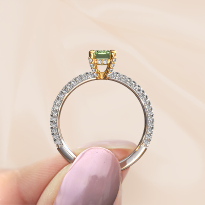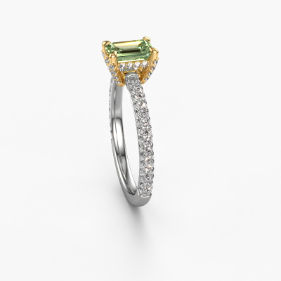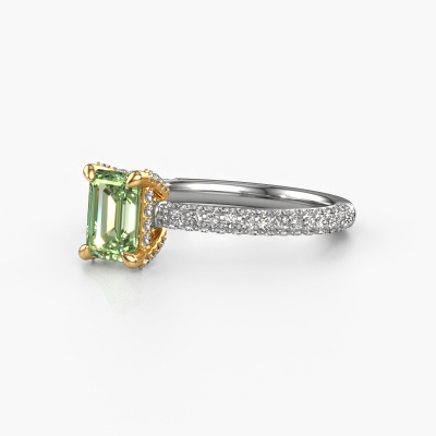 Der oben gezeigte Weißgold Verlobungsring wird Saskia eme 2 genannt. Es ist ein Pavé Solitär Ring, da er einen zentralen Edelstein und ein Band mit Pavé-Fassung hat. Der exklusive Pavé Solitär Verlobungsring ist in der Kombination 14 Karat Weißgold mit Gold und ist mit einem smaragd schliff 6.5x4.5 mm grüner Labor-Diamant-Mittelstein besetzt und das Band hat eine Pavé-Fassung mit Diamanten. Jedes Schmuckstück wird hergestellt von einem Team leidenschaftlicher Goldschmiede und Schmuckdesigner. Das wird Ihr Kronjuwel unbedingt zu einem Blickfang machen. Um den zentralen Stein noch mehr zu betonen, hat das Band eine Pavé-Fassung mit weiteren grüner Labor-Diamant. Durch die offenen Krappen kann das Licht aus mehreren Winkeln auf den grüner Labor-Diamant treffen und der grüner Labor-Diamant-Ring funkelt noch mehr. Das obere Foto zeigt die leidenschaftlich handgefertigten Details des Rings. Die hohe Positionierung der Mittelstein ist ein echter Blickfang. Der perfekte Verlobungsring für das Kronjuwel Ihres Lebens!Mit unserer modernen Technik können wir Schmuckstücke von höchster Qualität mit größter Sorgfalt für Sie entwerfen und anpassen. Unsere Verlobungsringe sind immer um 30 Prozent günstiger als bei anderen Juwelieren. Wir fertigen Verlobungsringe auf Bestellung, also müssen wir keine großen Lager unterhalten. Wenn Sie ein bestimmtes Budget haben, beraten wir Sie gerne entsprechend.Verschiedene Arten von neuen Ringen werden täglich von unserem Team angefertigt. Vielleicht haben Sie irgendwo einen Pavé Solitär Verlobungsring gefunden. Einen, den Sie Ihrem Liebsten schenken möchten. Bitte zögern Sie nicht, unseren Schmuckdesignern Ihre Gedanken und Ihr Design zu zeigen. Wir würden gerne Ihr Design in einen exklusive Verlobungsring verwandeln. Sie können die Entwicklungen Ihres Ringdesigns verfolgen, da wir sehr detaillierte 3D-Zeichnungen verwenden. Darüber hinaus können Sie einen Dummy des Designs bestellen. Ein Dummy ist ein Kunststoffring, der nach Ihrem Ringdesign gestaltet werden kann. Sie können ihn anprobieren und prüfen, ob der Verlobungsring Ihren Vorstellungen entspricht. Wir senden Ihnen gerne ein unverbindliches Angebot zu einem fairen Preis/Leistungsverhältnis. Das Angebot wird Sie angesichts der Qualität des Rings und der Edelsteine verblüffen.Um es einfacher zu machen, bieten wir eine kostenlose 30-tägige Rücksendung.