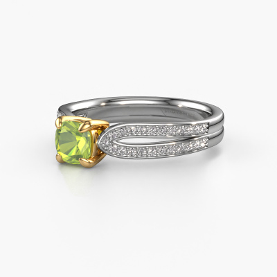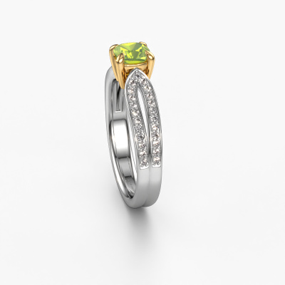 Der oben gezeigte Weißgold Verlobungsring wird Antonia cus 2 genannt. Es ist ein Pavé Solitär Ring, da er einen zentralen Edelstein und ein Band mit Pavé-Fassung hat. Der Fantasie Pavé Solitär Verlobungsring ist in der Kombination 14 Karat Weißgold mit Gold und ist mit einem cussion 5 mm Peridot-Mittelstein besetzt und das Band hat eine Pavé-Fassung mit Lab grown Diamant. Jedes Schmuckstück wird von unseren Meister-Goldschmieden in unserem eigenen Studio für Sie gefertigt. Um den zentralen Stein noch mehr zu betonen, hat das Band eine Pavé-Fassung mit weiteren Peridot. Durch die offenen Krappen kann das Licht aus mehreren Winkeln auf den Peridot treffen und der Peridot-Ring funkelt noch mehr. Das obere Foto zeigt die leidenschaftlich handgefertigten Details des Rings. Die hohe Positionierung der Mittelstein ist ein echter Blickfang. Der perfekte Verlobungsring für das Kronjuwel Ihres Lebens!Mit unserer modernen Technik können wir Schmuckstücke von höchster Qualität mit größter Sorgfalt für Sie entwerfen und anpassen. Unsere Verlobungsringe sind immer um 30 Prozent günstiger als bei anderen Juwelieren. Wir fertigen Verlobungsringe auf Bestellung, also müssen wir keine großen Lager unterhalten. Wenn Sie ein bestimmtes Budget haben, beraten wir Sie gerne entsprechend.Haben Sie irgendwo einen bestimmten Verlobungsring gefunden, den Sie Ihrem Liebsten schenken möchten? Sie können uns gerne sagen, was Sie wollen und wir werden Ihr Design in einen Einzigartigen Fantasie Verlobungsring verwandeln. Sie können die Entwicklungen Ihres Ringdesigns verfolgen, da wir 3D-Zeichnungen verwenden. Das gibt Ihnen eine realistische Vorschau, wie Ihr Design aussehen wird. Sie können auch einen Dummy vorbestellen. Ein Dummy ist ein Kunststoffring, der nach Ihrem Ringdesign gestaltet werden kann. Sie können ihn anprobieren und prüfen, ob seine Breite und Größe für Sie geeignet sind. Wir senden Ihnen gerne ein unverbindliches Angebot zu einem fairen Preis/Leistungsverhältnis. Sie werden in Anbetracht der Qualität des Rings und der Edelsteine überrascht sein.Um es einfacher zu machen, bieten wir eine kostenlose 30-tägige Rücksendung.