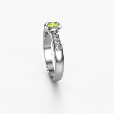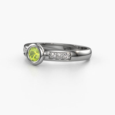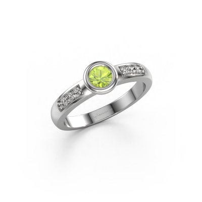 Der oben gezeigte Weißgold Verlobungsring wird Lieke genannt. Es ist ein Pavé Solitär Ring, da er einen zentralen Edelstein und ein Band mit Pavé-Fassung hat. Der klassische Pavé Solitär Verlobungsring ist in der Kombination 14 Karat Weißgold mit Weißgold und ist mit einem rund 4 mm Peridot-Mittelstein besetzt und das Band hat eine Pavé-Fassung mit Diamanten. Jedes Schmuckstück ist einzigartig in jeder Hinsicht! Einfach nach Ihren Wünschen anzupassen. Um den zentralen Stein noch mehr zu betonen, hat das Band eine Pavé-Fassung mit weiteren Peridot. Durch die offenen Krappen kann das Licht aus mehreren Winkeln auf den Peridot treffen und der Peridot-Ring funkelt noch mehr. Das obere Foto zeigt die leidenschaftlich handgefertigten Details des Rings. Die hohe Positionierung der Mittelstein ist ein echter Blickfang. Der perfekte Verlobungsring für das Kronjuwel Ihres Lebens!Durch die Kombination modernster Technik mit uralter Handwerkskunst können wir alle Verlobungsringe in unserem eigenen Studio anfertigen. Jedes Schmuckstück wird auf Anfrage gefertigt. Das ist vorteilhaft, weil wir Ihnen dadurch einen Preis anbieten können, den Sie nirgendwo anders finden.Verschiedene Arten von neuen Ringen werden täglich von unserem Team angefertigt. Vielleicht haben Sie irgendwo einen Pavé Solitär Verlobungsring gefunden. Einen, den Sie Ihrem Liebsten schenken möchten. Bitte zögern Sie nicht, unseren Schmuckdesignern Ihre Gedanken und Ihr Design zu zeigen. Wir würden gerne Ihr Design in einen klassische Verlobungsring verwandeln. Sie können die Entwicklungen Ihres Ringdesigns verfolgen, da wir sehr detaillierte 3D-Zeichnungen verwenden. Darüber hinaus können Sie einen Dummy des Designs bestellen. Ein Dummy ist ein Kunststoffring, der nach Ihrem Ringdesign gestaltet werden kann. Sie können ihn anprobieren und prüfen, ob der Verlobungsring Ihren Vorstellungen entspricht. Wir senden Ihnen gerne ein unverbindliches Angebot zu einem fairen Preis/Leistungsverhältnis. Das Angebot wird Sie angesichts der Qualität des Rings und der Edelsteine verblüffen.Um es einfacher zu machen, bieten wir eine kostenlose 30-tägige Rücksendung.