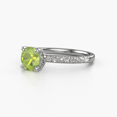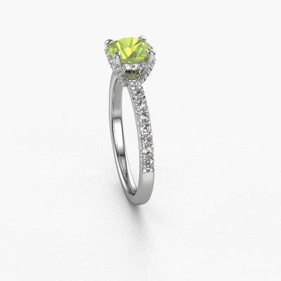 Der oben gezeigte Weißgold Verlobungsring wird Saskia rnd 1 genannt. Es ist ein Pavé Solitär Ring, da er einen zentralen Edelstein und ein Band mit Pavé-Fassung hat. Der exklusive Pavé Solitär Verlobungsring ist in der Kombination 14 Karat Weißgold mit Weißgold und ist mit einem rund 6.5 mm Peridot-Mittelstein besetzt und das Band hat eine Pavé-Fassung mit Lab grown Diamant. Jedes Schmuckstück wird hergestellt mit Leidenschaft und Liebe, von einem unserer Meister-Goldschmiede. Um den zentralen Stein noch mehr zu betonen, hat das Band eine Pavé-Fassung mit weiteren Peridot. Durch die offenen Krappen kann das Licht aus mehreren Winkeln auf den Peridot treffen und der Peridot-Ring funkelt noch mehr. Das obere Foto zeigt die leidenschaftlich handgefertigten Details des Rings. Die hohe Positionierung der Mittelstein ist ein echter Blickfang. Der perfekte Verlobungsring für das Kronjuwel Ihres Lebens!Durch die Kombination modernster Technik mit uralter Handwerkskunst können wir alle Verlobungsringe in unserem eigenen Studio anfertigen. Jedes Schmuckstück wird auf Anfrage gefertigt. Das ist vorteilhaft, weil wir Ihnen dadurch einen Preis anbieten können, den Sie nirgendwo anders finden.Haben Sie einen bestimmten Ring im Sinn? Eines, dass Sie irgendwo gesehen haben. Bitte zögern Sie nicht, uns zu sagen, was Sie wollen und wir werden Ihr Design in einen Einzigartigen Verlobungsring verwandeln. Sie können die Entwicklungen Ihres Ringdesigns verfolgen, da wir 3D-Zeichnungen verwenden. Das gibt Ihnen eine realistische Vorschau Ihres Designs. Wir senden Ihnen gerne ein unverbindliches Angebot zu einem fairen Preis/Leistungsverhältnis. Es wird Sie erstaunen.Um es einfacher zu machen, bieten wir eine kostenlose 30-tägige Rücksendung.