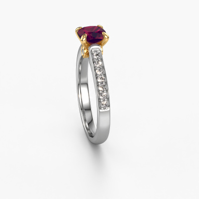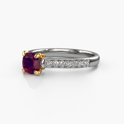 Der oben gezeigte Weißgold Verlobungsring wird Valorie cus 2 genannt. Es ist ein Pavé Solitär Ring, da er einen zentralen Edelstein und ein Band mit Pavé-Fassung hat. Der traditionell Pavé Solitär Verlobungsring ist in der Kombination 14 Karat Weißgold mit Gold und ist mit einem cussion 5.5 mm Rhodolit-Mittelstein besetzt und das Band hat eine Pavé-Fassung mit Diamanten. Jedes Schmuckstück wird von unseren Meister-Goldschmieden in unserem eigenen Studio für Sie gefertigt. Um den zentralen Stein noch mehr zu betonen, hat das Band eine Pavé-Fassung mit weiteren Rhodolit. Durch die offenen Krappen kann das Licht aus mehreren Winkeln auf den Rhodolit treffen und der Rhodolit-Ring funkelt noch mehr. Das obere Foto zeigt die leidenschaftlich handgefertigten Details des Rings. Die hohe Positionierung der Mittelstein ist ein echter Blickfang. Der perfekte Verlobungsring für das Kronjuwel Ihres Lebens!Durch die Kombination modernster Technik mit uralter Handwerkskunst können wir alle Verlobungsringe in unserem eigenen Studio anfertigen. Jedes Schmuckstück wird auf Anfrage gefertigt. Das ist vorteilhaft, weil wir Ihnen dadurch einen Preis anbieten können, den Sie nirgendwo anders finden.Unsere Designer und Goldschmiede arbeiten jeden Tag zusammen und versuchen, neue Schmuckstücke zu kreieren. Vielleicht haben Sie irgendwo einen schönen, traditionell Verlobungsring gefunden, nach dem Ihr einzigartiger Ring gestaltet werden kann. Setzen Sie sich mit uns in Verbindung. Wir machen Ihnen ein Angebot, basierend auf einem fairen Preis/Leistungsverhältnis, das Sie begeistern wird.Um es einfacher zu machen, bieten wir eine kostenlose 30-tägige Rücksendung.