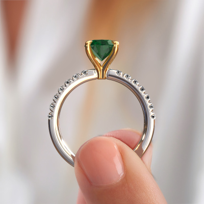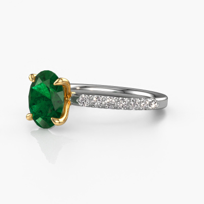 Der oben gezeigte Weißgold Verlobungsring wird Crystal OVL 2 genannt. Es ist ein Pavé Solitär Ring, da er einen zentralen Edelstein und ein Band mit Pavé-Fassung hat. Der exklusive Pavé Solitär Verlobungsring ist in der Kombination 14 Karat Weißgold mit Gold und ist mit einem oval 9x7 mm Smaragd-Mittelstein besetzt und das Band hat eine Pavé-Fassung mit Lab grown Diamant. Jedes Schmuckstück wird von unseren Meister-Goldschmieden in unserem eigenen Studio für Sie gefertigt. Um den zentralen Stein noch mehr zu betonen, hat das Band eine Pavé-Fassung mit weiteren Smaragd. Durch die offenen Krappen kann das Licht aus mehreren Winkeln auf den Smaragd treffen und der Smaragd-Ring funkelt noch mehr. Das obere Foto zeigt die leidenschaftlich handgefertigten Details des Rings. Die hohe Positionierung der Mittelstein ist ein echter Blickfang. Der perfekte Verlobungsring für das Kronjuwel Ihres Lebens!Durch die Kombination modernster Technik mit uralter Handwerkskunst können wir alle Verlobungsringe in unserem eigenen Studio anfertigen. Jedes Schmuckstück wird auf Anfrage gefertigt. Das ist vorteilhaft, weil wir Ihnen dadurch einen Preis anbieten können, den Sie nirgendwo anders finden.Unser Team fügt unserer Online-Kollektion täglich neue Designs hinzu. Unsere Designer und Goldschmiede arbeiten zusammen, um das beste Design zu kreieren. Wir bemühen uns, eine vielfältige Kollektion von Schmuckstücken anzubieten. Vielleicht haben Sie ein bestimmtes Design im Sinn. Eines, dass Sie irgendwo gesehen haben. Gerne geben wir Ihnen eine kostenlose Beratung. Wir machen Ihnen ein Angebot, basierend auf einem fairen Preis/Leistungsverhältnis, das Sie verblüffen wird.Um es einfacher zu machen, bieten wir eine kostenlose 30-tägige Rücksendung.