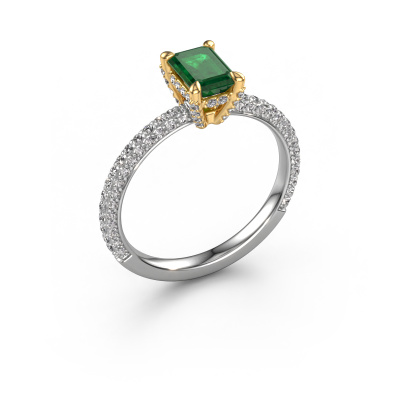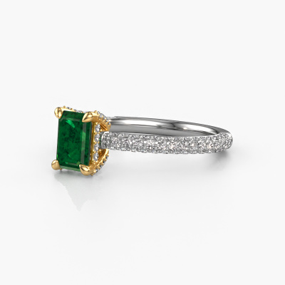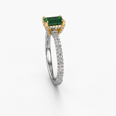 Der oben gezeigte Weißgold Verlobungsring wird Saskia eme 2 genannt. Es ist ein Pavé Solitär Ring, da er einen zentralen Edelstein und ein Band mit Pavé-Fassung hat. Der exklusive Pavé Solitär Verlobungsring ist in der Kombination 14 Karat Weißgold mit Gold und ist mit einem smaragd schliff 6.5x4.5 mm Smaragd-Mittelstein besetzt und das Band hat eine Pavé-Fassung mit Diamanten. Jedes Schmuckstück wird hergestellt von einem Team leidenschaftlicher Goldschmiede und Schmuckdesigner. Das wird Ihr Kronjuwel unbedingt zu einem Blickfang machen. Um den zentralen Stein noch mehr zu betonen, hat das Band eine Pavé-Fassung mit weiteren Smaragd. Durch die offenen Krappen kann das Licht aus mehreren Winkeln auf den Smaragd treffen und der Smaragd-Ring funkelt noch mehr. Das obere Foto zeigt die leidenschaftlich handgefertigten Details des Rings. Die hohe Positionierung der Mittelstein ist ein echter Blickfang. Der perfekte Verlobungsring für das Kronjuwel Ihres Lebens!Mit unserer modernen Technik können wir Schmuckstücke von höchster Qualität mit größter Sorgfalt für Sie entwerfen und anpassen. Unsere Verlobungsringe sind immer um 30 Prozent günstiger als bei anderen Juwelieren. Wir fertigen Verlobungsringe auf Bestellung, also müssen wir keine großen Lager unterhalten. Wenn Sie ein bestimmtes Budget haben, beraten wir Sie gerne entsprechend.Verschiedene Arten von neuen Ringen werden täglich von unserem Team angefertigt. Vielleicht haben Sie irgendwo einen Pavé Solitär Verlobungsring gefunden. Einen, den Sie Ihrem Liebsten schenken möchten. Bitte zögern Sie nicht, unseren Schmuckdesignern Ihre Gedanken und Ihr Design zu zeigen. Wir würden gerne Ihr Design in einen exklusive Verlobungsring verwandeln. Sie können die Entwicklungen Ihres Ringdesigns verfolgen, da wir sehr detaillierte 3D-Zeichnungen verwenden. Darüber hinaus können Sie einen Dummy des Designs bestellen. Ein Dummy ist ein Kunststoffring, der nach Ihrem Ringdesign gestaltet werden kann. Sie können ihn anprobieren und prüfen, ob der Verlobungsring Ihren Vorstellungen entspricht. Wir senden Ihnen gerne ein unverbindliches Angebot zu einem fairen Preis/Leistungsverhältnis. Das Angebot wird Sie angesichts der Qualität des Rings und der Edelsteine verblüffen.Um es einfacher zu machen, bieten wir eine kostenlose 30-tägige Rücksendung.