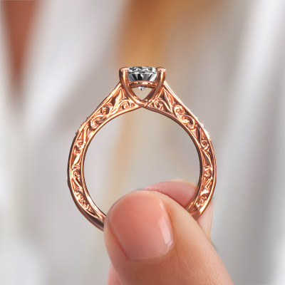 Der oben gezeigte Ring wird Mallory ovl genannt. Es ist ein Pavé Solitär Ring, da er einen zentralen Edelstein und ein Band mit Pavé-Fassung hat. Dieser 14 Karat Roségold ring ist mit einem 8x6 mm oval Zirkonia-Mittelstein besetzt und das Band hat eine Pavé-Fassung mit Lab grown Diamant. Jedes Schmuckstück wird hergestellt mit Leidenschaft und Liebe, von einem unserer Meister-Goldschmiede.Dieser traditionell Roségold Pavé Solitär Verlobungsring mit Pavé-Fassung hat einen exquisiten, oval Zirkonia als Mittelstein. Um den zentralen Stein noch mehr zu betonen, hat das Band eine Pavé-Fassung mit weiteren Lab grown Diamant. Durch die offenen Krappen kann das Licht aus mehreren Winkeln auf den Zirkonia treffen und der Zirkonia-Ring funkelt noch mehr. Das obere Foto zeigt die leidenschaftlich handgefertigten Details des Rings. Die hohe Positionierung der Mittelstein ist ein echter Blickfang. Der perfekte Verlobungsring für das Kronjuwel Ihres Lebens!Haben Sie ein bestimmtes Budget? Sie können uns gerne kontaktieren, damit wir Ihre Optionen besprechen können. Wir bieten unsere Verlobungsringe zum garantiert besten Preis, denn wir fertigen sie auf Bestellung. Solche Preise finden Sie nirgendwo anders!Unser Team fügt unserer Online-Kollektion täglich neue Designs hinzu. Unsere Designer und Goldschmiede arbeiten zusammen, um das beste Design zu kreieren. Wir bemühen uns, eine vielfältige Kollektion von Schmuckstücken anzubieten. Vielleicht haben Sie ein bestimmtes Design im Sinn. Eines, dass Sie irgendwo gesehen haben. Gerne geben wir Ihnen eine kostenlose Beratung. Wir machen Ihnen ein Angebot, basierend auf einem fairen Preis/Leistungsverhältnis, das Sie verblüffen wird.Um es einfacher zu machen, bieten wir eine kostenlose 30-tägige Rücksendung.